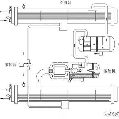二、冷凝過程:由壓縮機(jī)來的高壓、高溫制冷劑蒸汽,在冷凝器中通過管內(nèi)的冷卻水放出熱量,溫度有所下降,同時(shí)在飽和壓力(冷凝溫度所對應(yīng)的冷凝壓力)下,冷凝成為液體。這時(shí),冷卻水因從制冷劑蒸汽中攝取了熱量,其溫度要有所升高。冷卻水的溫度與冷凝溫度(冷凝壓力)直接有關(guān)。